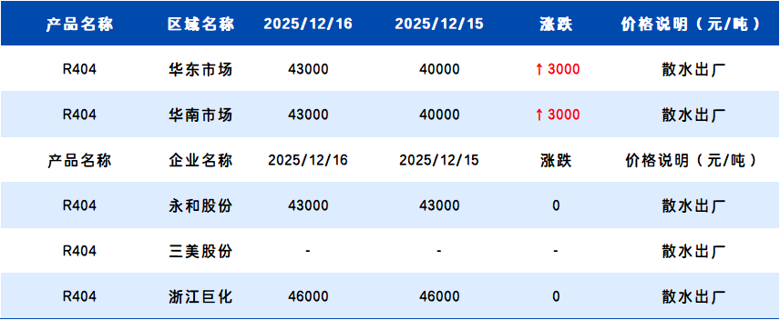 【R404】12月16日国内R404价格一览表
