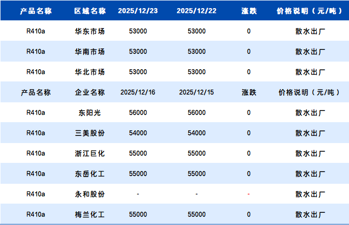 【R410a】12月23日国内R410a价格一览表