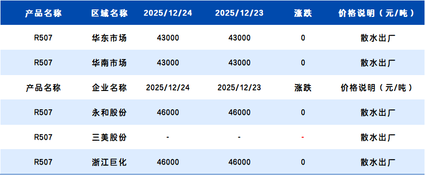 【R507】12月24日国内R507价格一览表