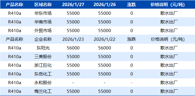 【R410a】1月27日市场价格一览表