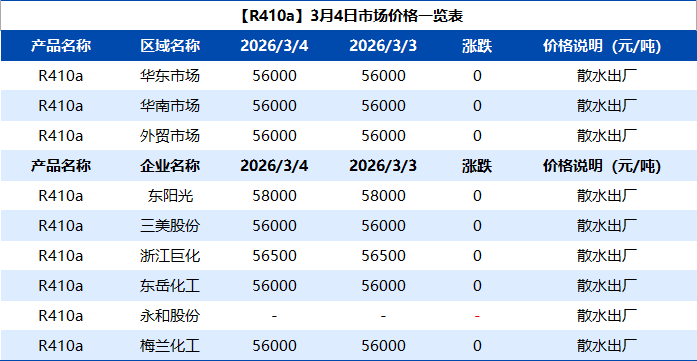 【R410a】3月4日市场价格一览表