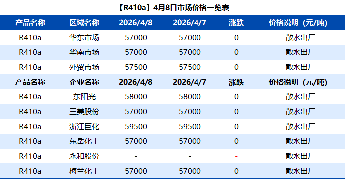 【R410a】4月8日市场价格一览表