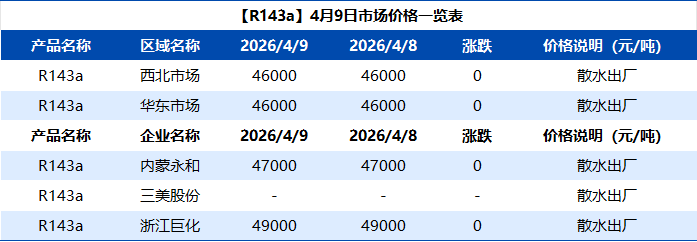 【R143a】4月9日市场价格一览表