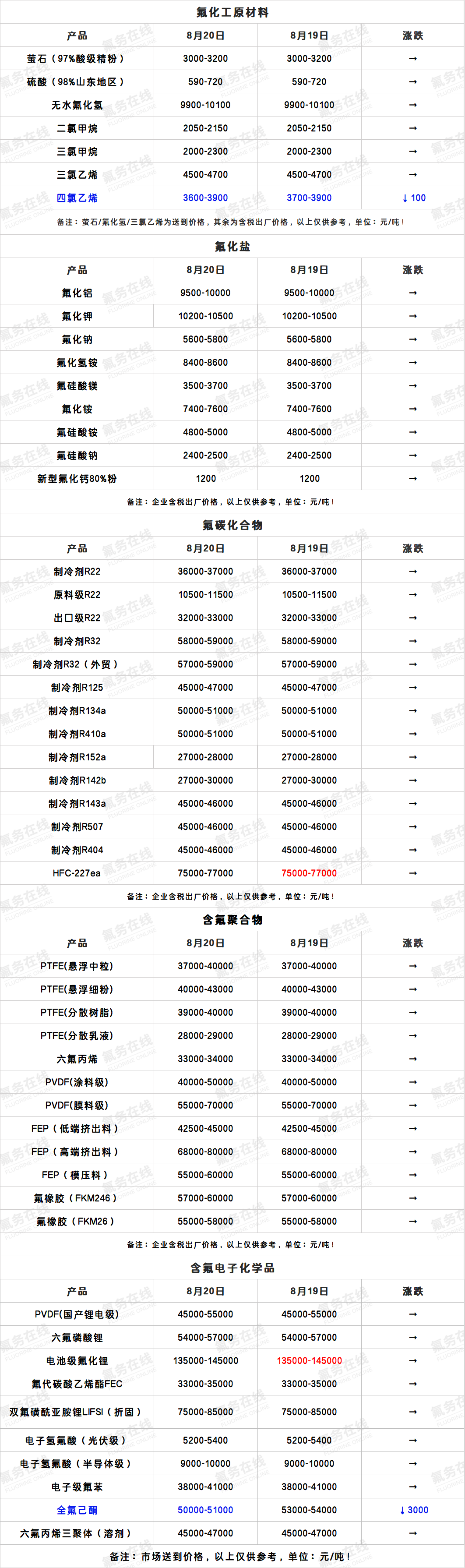 8月20日氟化工产业链价格表