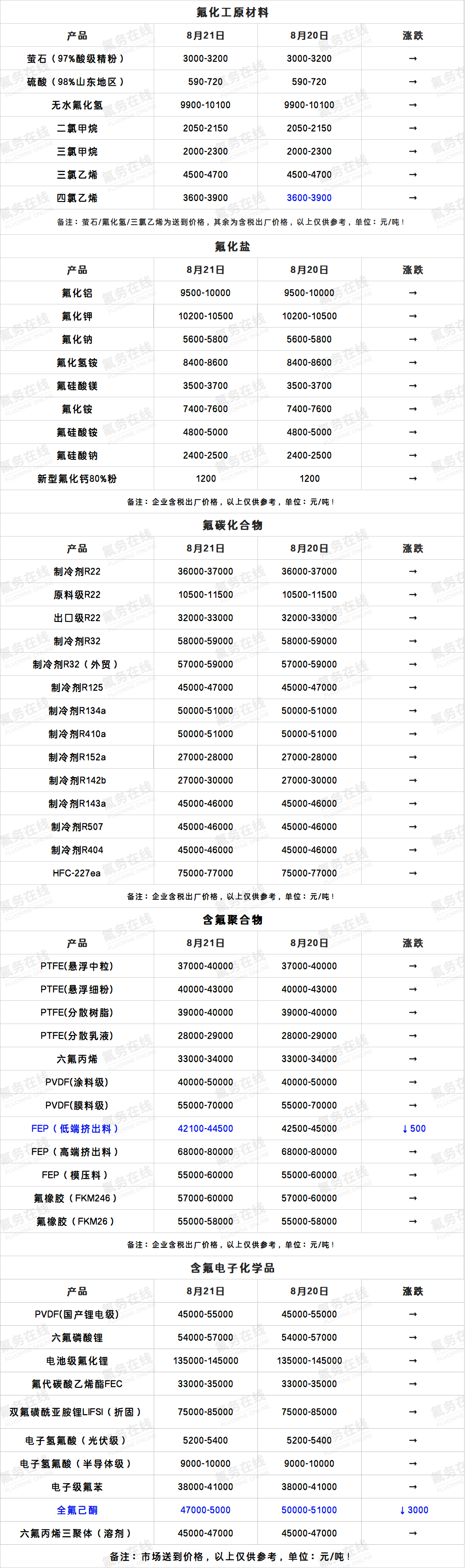 8月21日氟化工产业链价格表