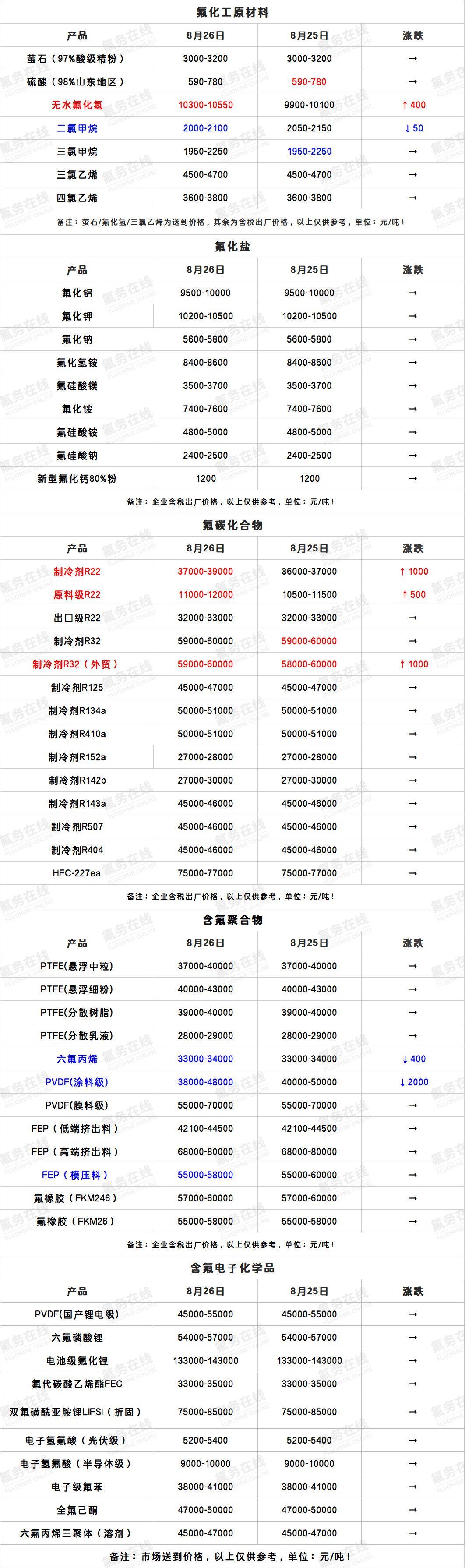 8月26日氟化工产业链价格表