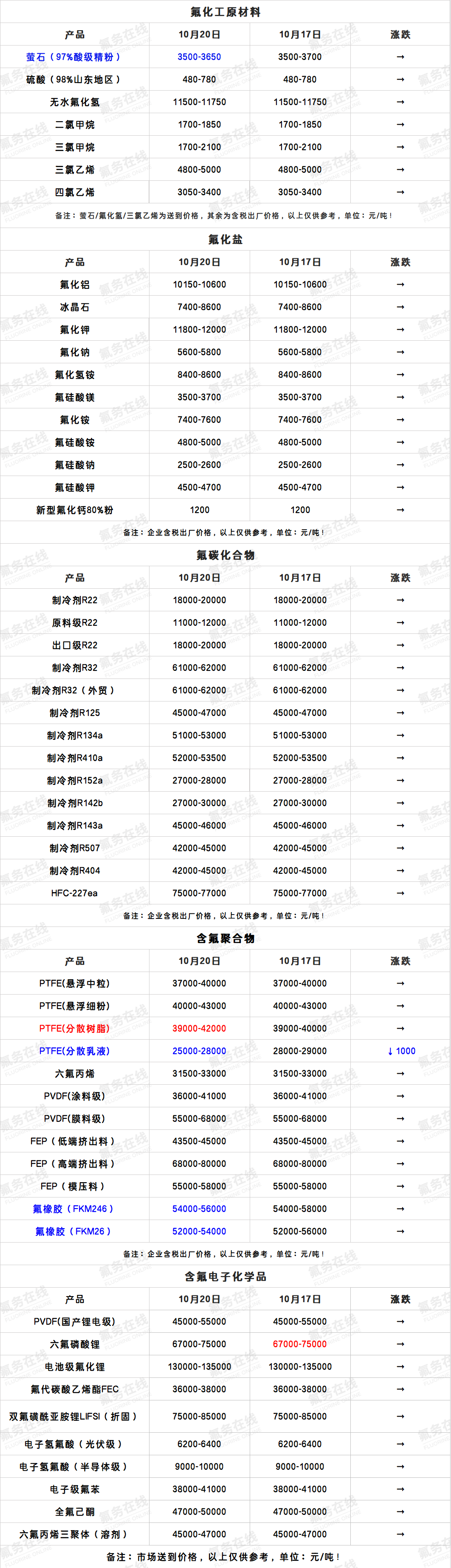 10月20日氟化工产业链价格表