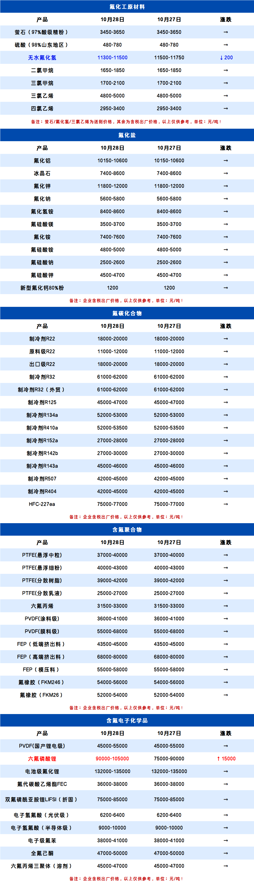 10月28日氟化工产业链价格表