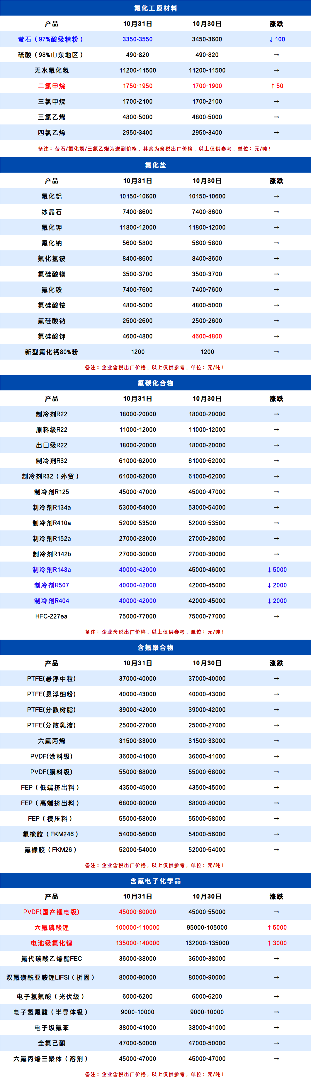 10月31日氟化工产业链价格表