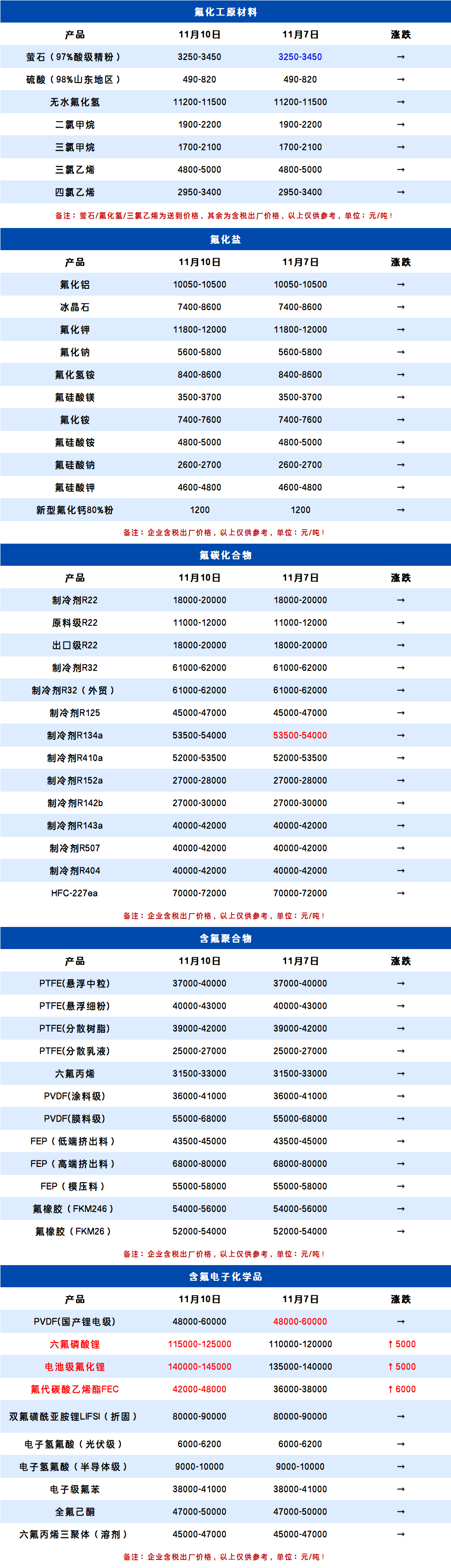 11月10日氟化工产业链价格表