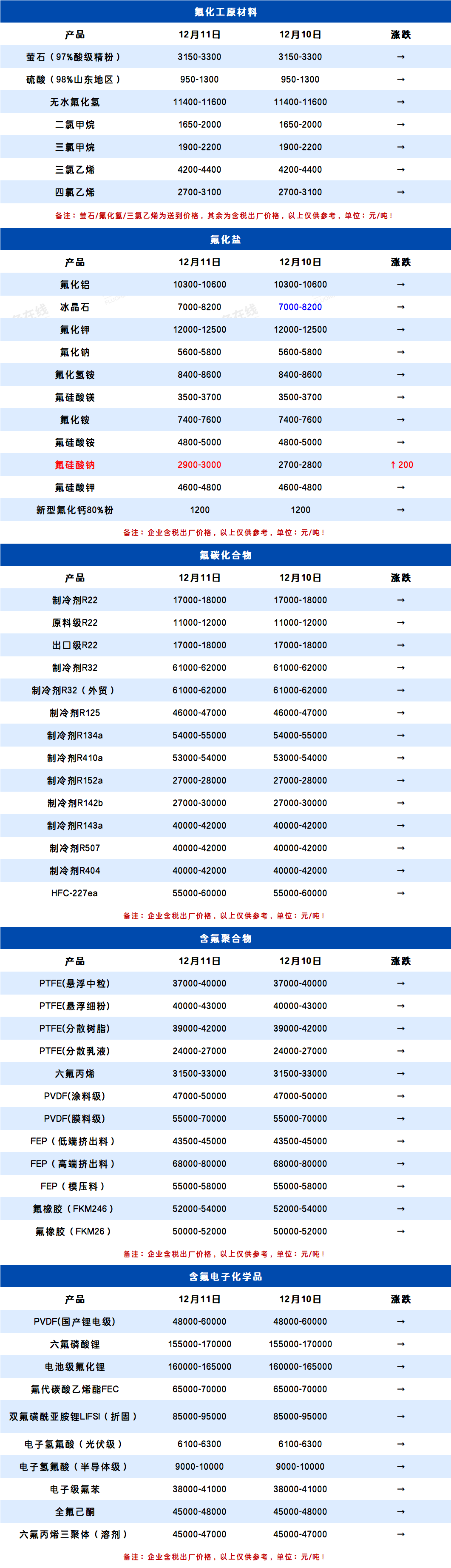 12月11日氟化工产业链价格表