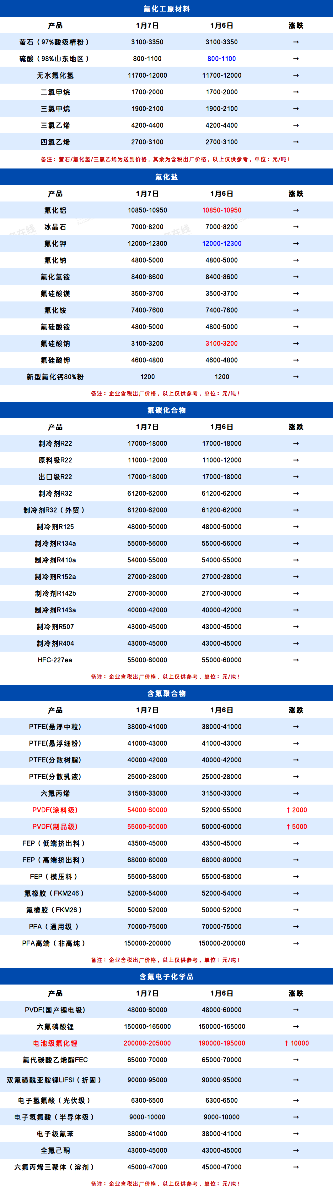 1月7日氟化工产业链价格表
