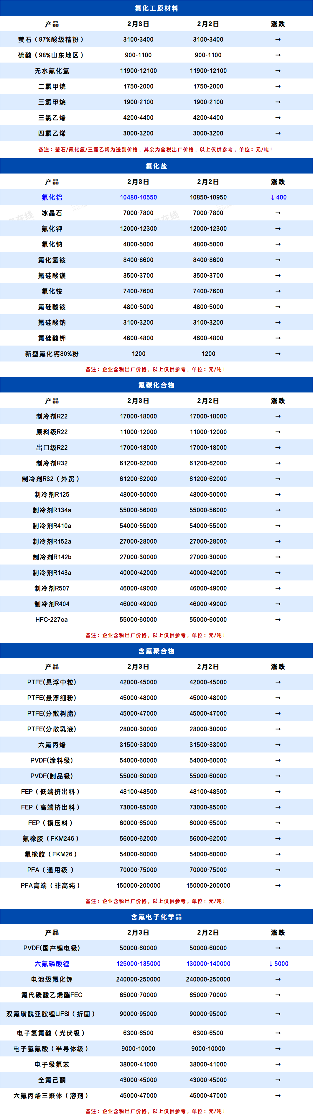 所属分类:全产业链价格表 阅读次数:223 发布时间:2026-02-03 内容来源:氟务在线