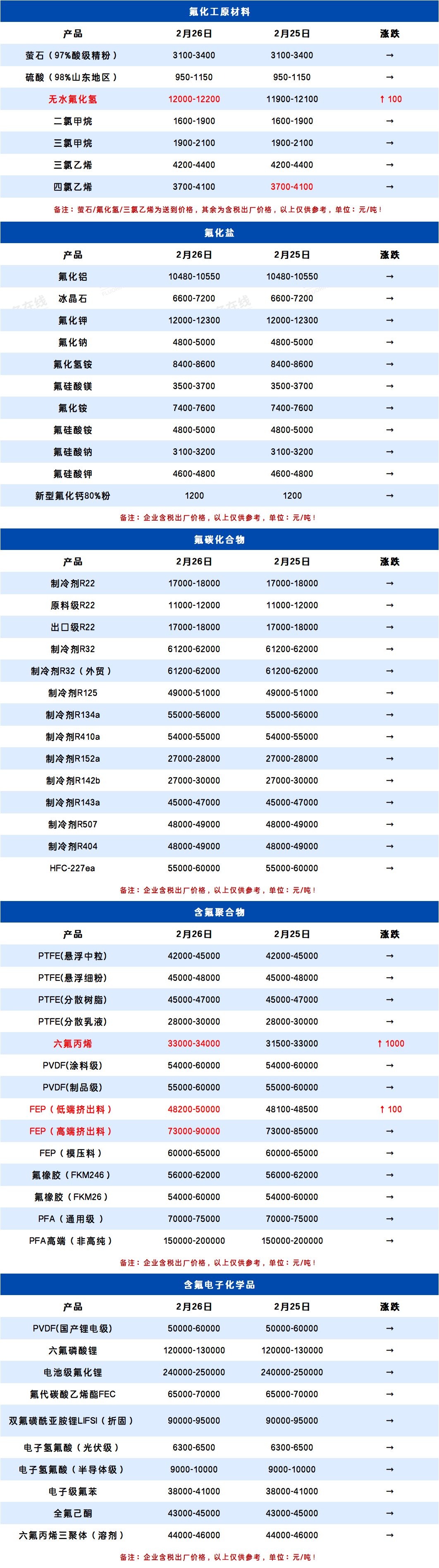 所属分类:全产业链价格表 阅读次数:103 发布时间:2026-02-26 内容来源:氟务在线