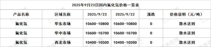 2025年9月23日国内氟化氢价格一览表