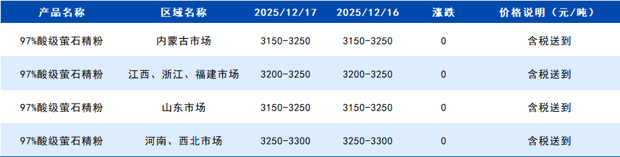 2025年12月17日国内萤石粉价格一览表