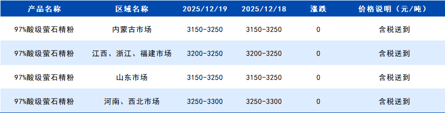 2025年12月19日国内萤石块价格一览表