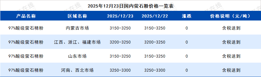 2025年12月23日国内萤石粉价格一览表