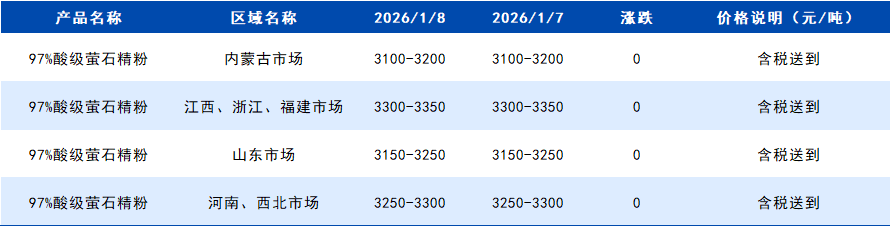 2026年1月8日国内萤石粉价格一览表
