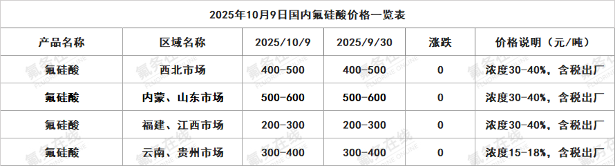 2025年10月9日国内氟硅酸价格一览表