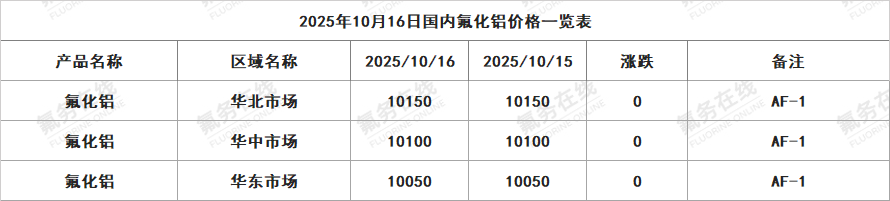 2025年10月16日国内氟化铝价格一览表