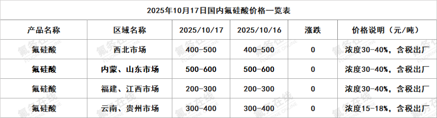 2025年10月17日国内氟硅酸价格一览表