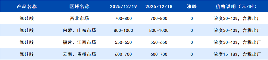 2025年12月19日国内氟硅酸价格一览表