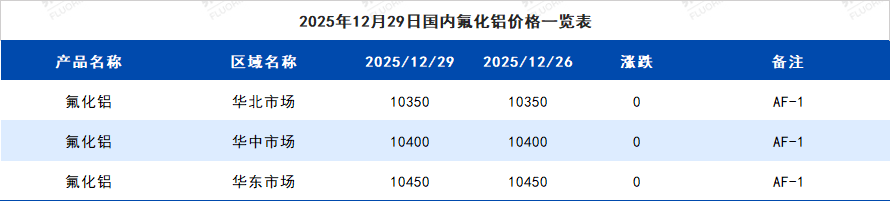 2025年12月29日国内氟化铝价格一览表