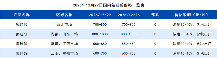 2025年12月29日国内氟硅酸价格一览表