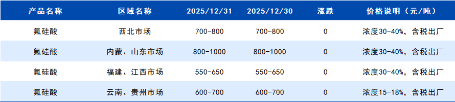 2025年12月31日国内氟硅酸价格一览表