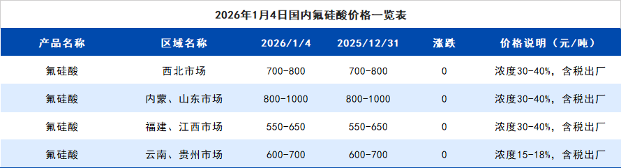 2026年1月4日国内氟硅酸价格一览表