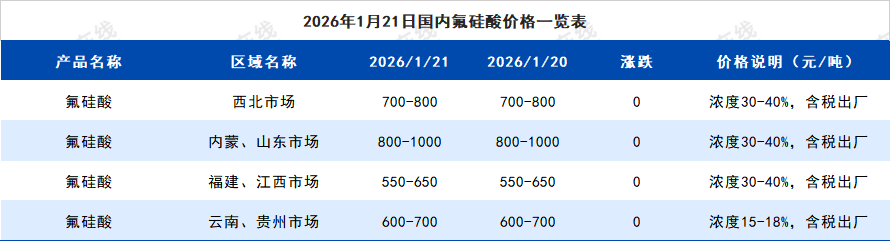 2026年1月21日国内氟硅酸价格一览表