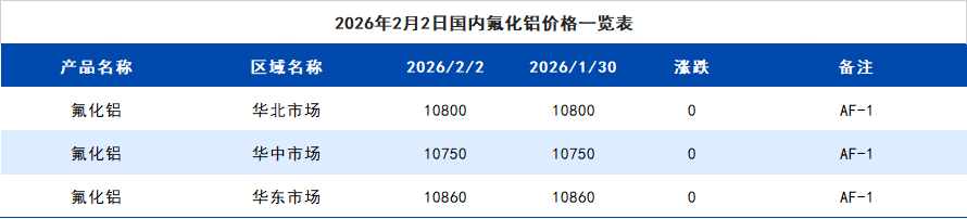 2026年2月2日国内氟化铝价格一览表