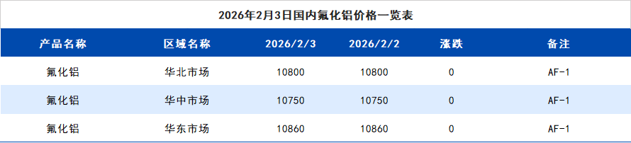 2026年2月3日国内氟化铝价格一览表