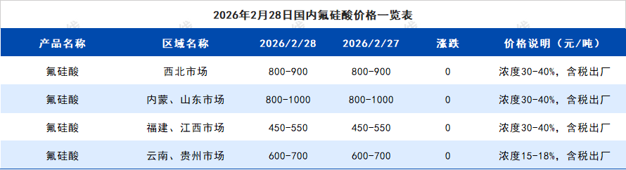 2026年2月28日国内氟硅酸价格一览表