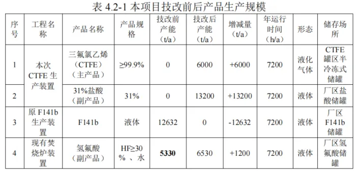 建设规模及内容:淘汰现有一氟二氯乙烷(F141b)生产装置,取消现有一氟二氯乙烷(F141b)产品全部产能12632吨/年,利旧F141b装置框架,新建供氢站(甲类,建筑面积340.90m2),利用现有管廊,新增至现有CTFE埋地罐区管道,对公用辅助设施进行适应性改造,以实现增产三氟氯乙烯(CTFE)6000吨/年、副产品盐酸13200吨/年,副产品氢氟酸1200吨/年。