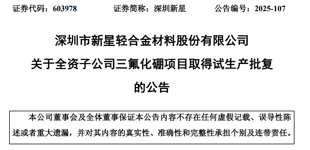 深圳新星:全资子公司三氟化硼项目取得试生产批复