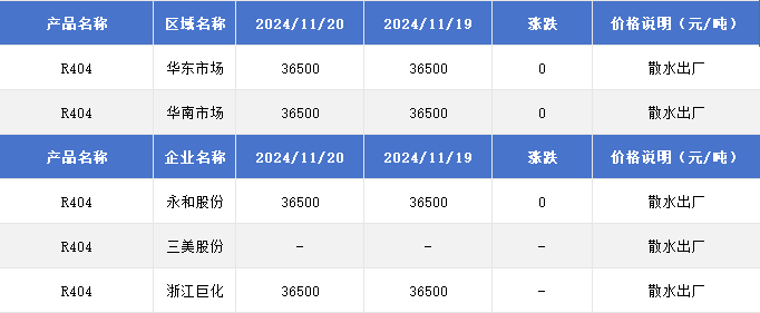 2024年11月20日国内R404价格一览表