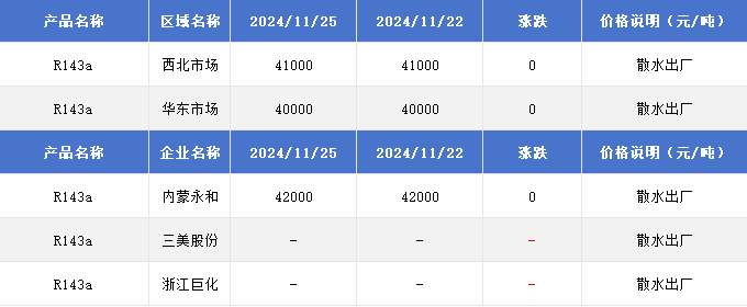 2024年11月25日国内R143a价格一览表