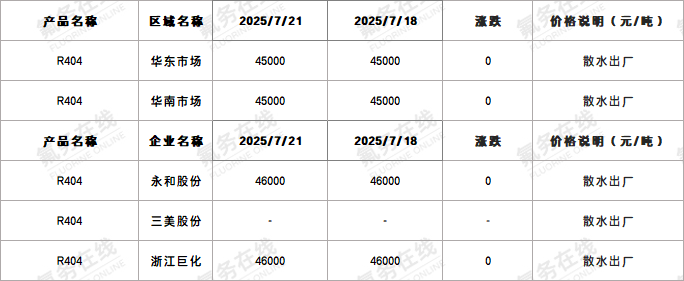 【R404】7月21日国内R404价格一览表