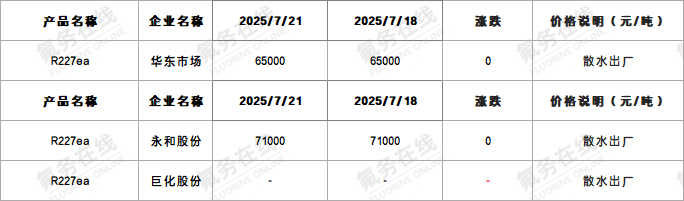 【R227ea】7月21日国内市场价格一览表