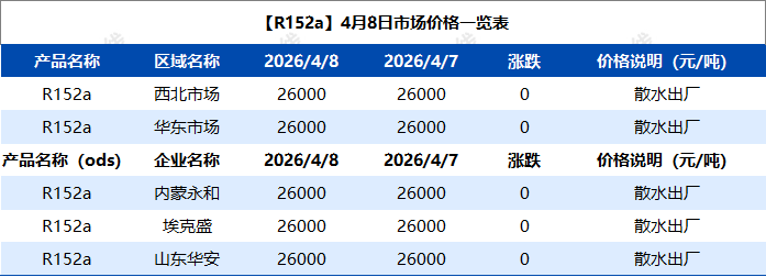 【R152a】4月8日市场价格一览表