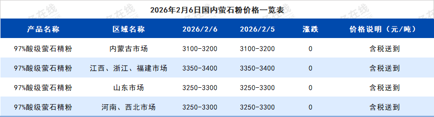 2026年2月6日国内萤石粉价格一览表