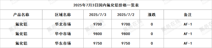 2025年7月3日国内氟化铝价格一览表