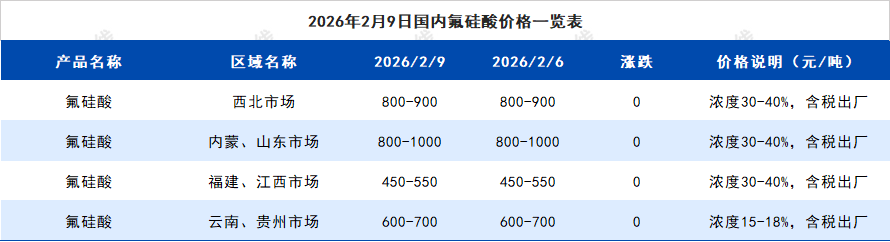 2026年2月9日国内氟硅酸价格一览表
