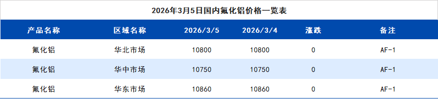 2026年3月5日国内氟化铝价格一览表