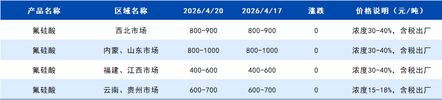 2026年4月20日国内氟硅酸价格一览表
