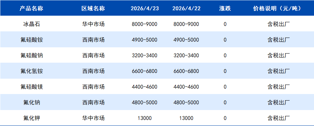2026年4月23日国内氟化盐价格一览表