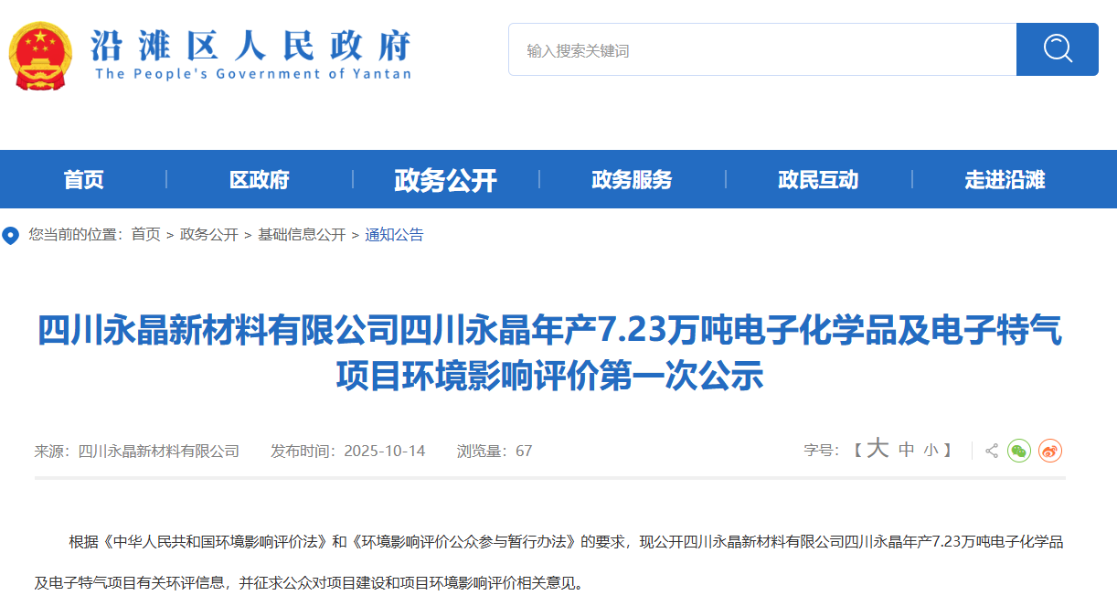 环评丨四川永晶年产7.23万吨电子化学品及电子特气项目公示