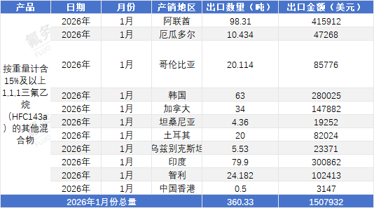 2026年1月份中国制冷剂R143a进出口统计(产销地区)